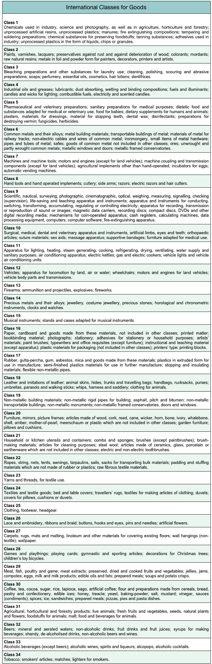 The thirty-four internationally recognised Class headings for goods in relation to trade marks.